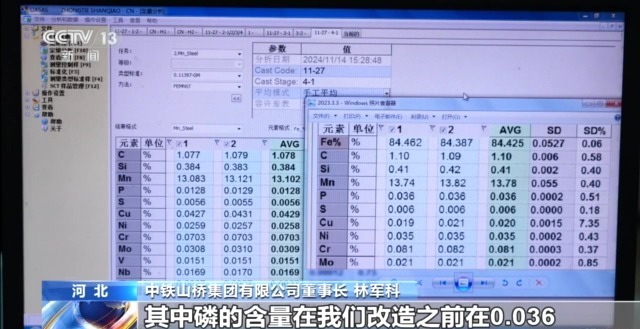 中鐵山橋集團有限公司董事長(cháng) 林軍科:這個(gè)表里可以清晰對比到,在改造升級之后,對有害元素、雜質(zhì)、夾雜物的控制,做到大幅度降低。其中磷的含量在改造之前是0.036,今年改造完之后,它控制到0.0128,這對轍叉的使用壽命會(huì )有顯著(zhù)改善。